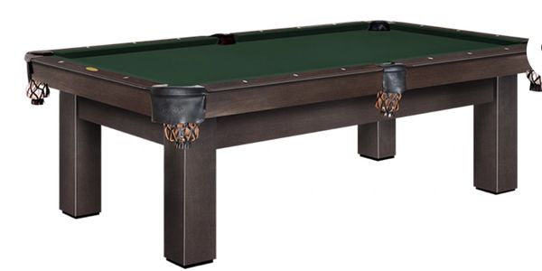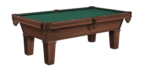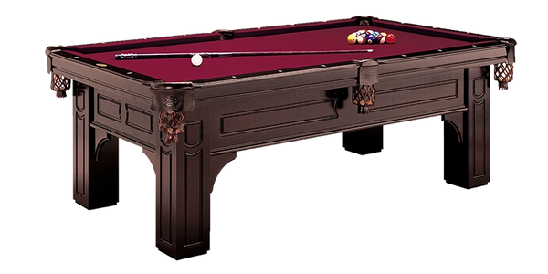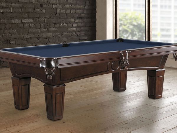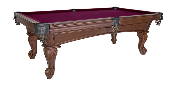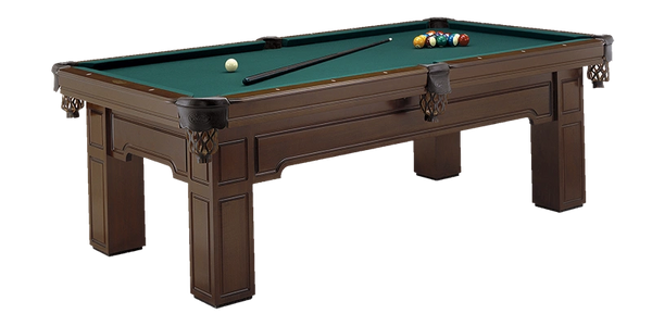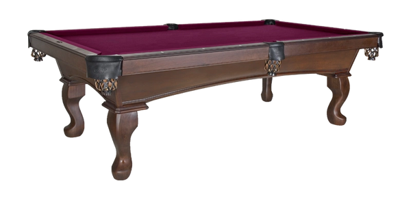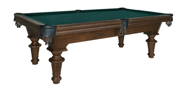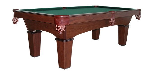 Available in 8', brand new. 1" slate, Warm Chestnut colored hardwood body, legs, and rails. Drop pockets. Sale includes new cloth in any color, 4 cues, bridge, ball set, and installation. Made in the U.S.A. In stock.