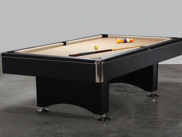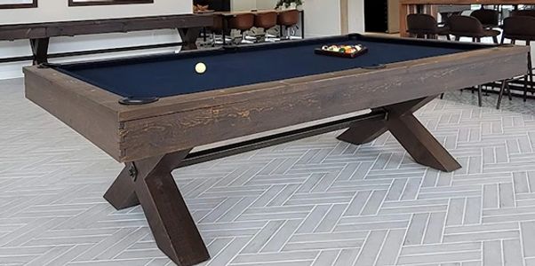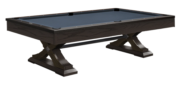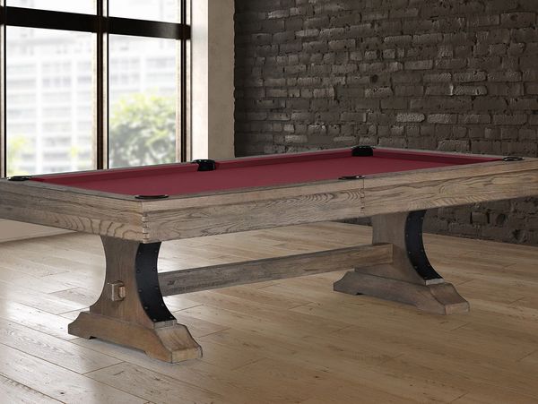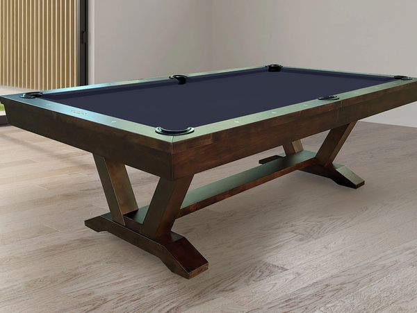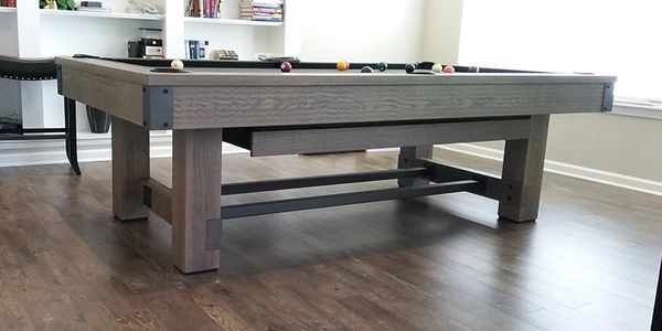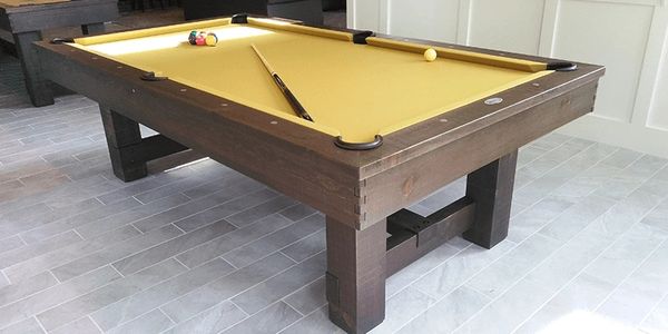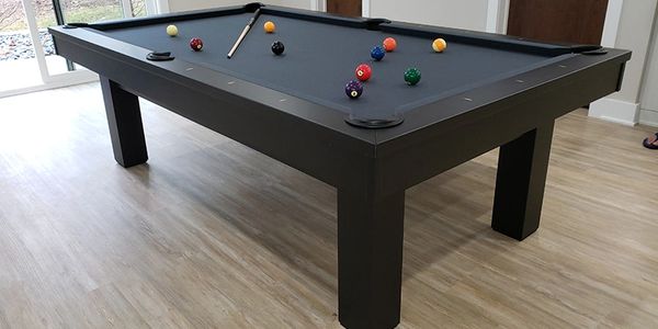 New. The Tustin pool table is made from Solid Wood and features flat panel aprons with unique style legs with a metal cross bar. Sale includes new cloth in any color, balls, cues, bridge, delivery and installation. Made in the U.S.A. 3-4 week order.