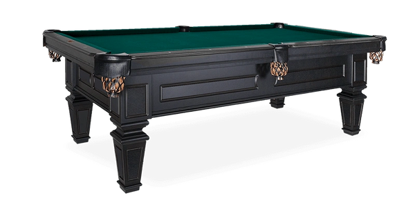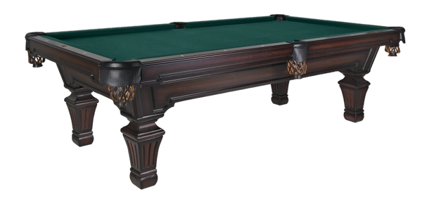 New 9'. The Innsbruck pool table is made from Solid Wood and features routered paneled cabinet design with flutted legs with routered detail. Sale includes new cloth in any color, balls, cues, bridge, delivery and installation. Made in the U.S.A. In stock.