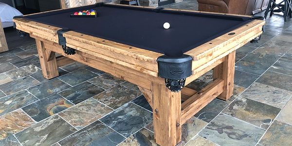 Available in 7' or 8', brand new. 1" slate, weathered brown hardwood body, legs, and rails. Drop pockets. Sale includes new cloth in any color, 4 cues, bridge, ball set, and installation. 1 week order.