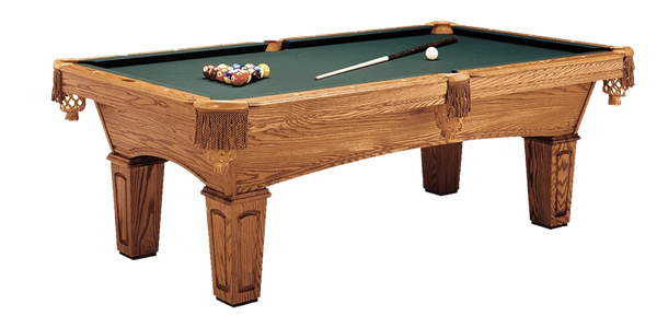 New 8', The Seville Pool table is made from solid Oak, and features flat paneled routered cabinet design with ornate carvings on the legs. Finished in upgraded Heritage Oak. Sale includes new cloth, all accessories, and installation. Made in the U.S.A. In stock.,